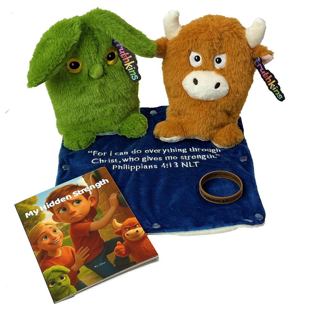 Every Truthkins set includes two plush toys, a silicone reminder wristband, a Bible blanket, and an illustrated kids' book.